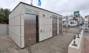 Eine neue 35 Tonnen schwere WC-Anlage mit drei Kabinen wurde am Strandaufgang 18 in Warnemünde aufgestellt.