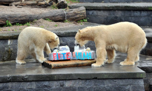 Großer Eisbären-Doppel-Geburtstag im Zoo Rostock: Jung-Eisbär-Fiete (1) und Mama-Eisbär Vilma (13) bekamen einiges an Leckereien verpackt.